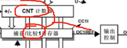 也就是这里CNT和CCR是作为比较电路的输入。根据CNT和CCR的大小关系,从引脚输出,高,低电平。