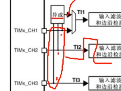 我们可以看到这里有一个三通道的异或门,异或门是当三个引脚的电平有任意一个反转时候,就会输出低电平。之后输出通过数据选择器,进入到输入捕获通道1,数据选择器如果选择上面的。那么输入捕获1的通道,就是三个引脚的异或值。如果选择下面的一个,那么异或门就没有用,输出是下面各自的通道。设计这个异或门其实还是为了三项无刷电机服务的。