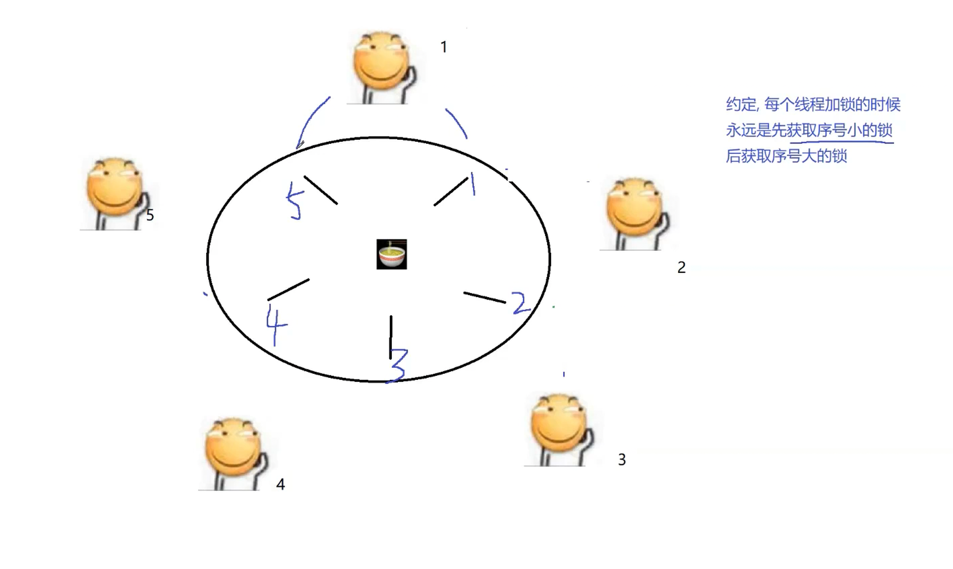 这是五个滑稽,滑稽1 如果拿着一个筷子,他吃不到这个面条,需要两个筷子,那他拿着只有个筷子,只能等待,此时每一个线程都持有一个筷子,正在等待阻塞,这时候就会产生死锁,这就是我们刚刚所说的死锁问题。