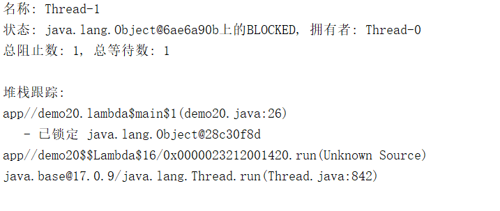 Thread-1处于BLOCKED 状态 ,原因是它在等待获取java.lang.Object@6ae6a90b这把锁,而该锁当前被Thread-0持有。 - 这符合 "线程因竞争锁而阻塞" 的场景,说明