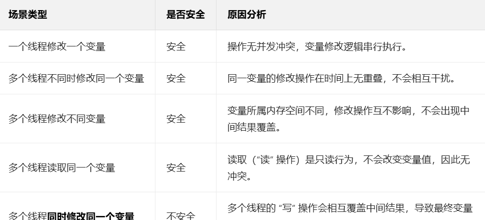 - 核心问题:多线程环境中,修改操作若不是原子的(即操作可被拆分),会引发线程安全问题。