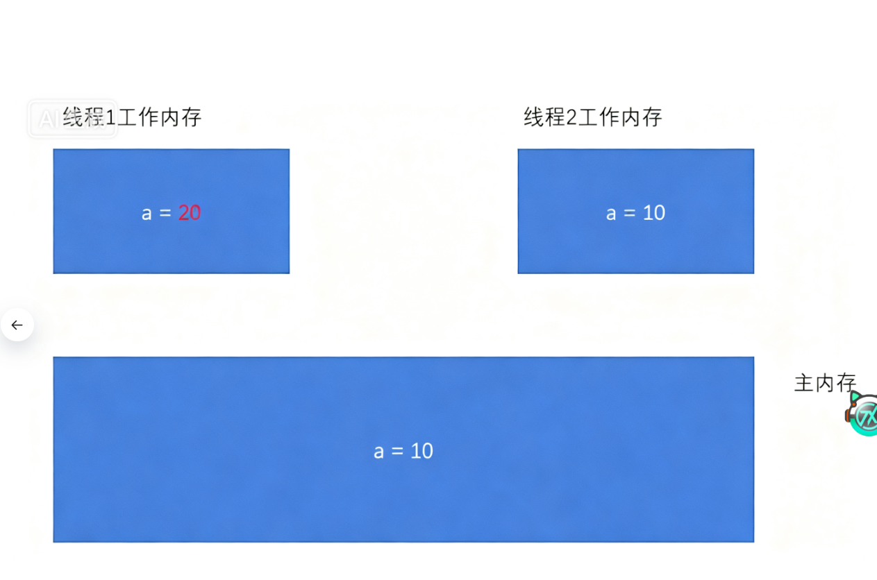 - ⼀旦线程1修改了a的值,此时主内存不⼀定能及时同步.对应的线程2的⼯作内存的a的值也不⼀定 能及时同步