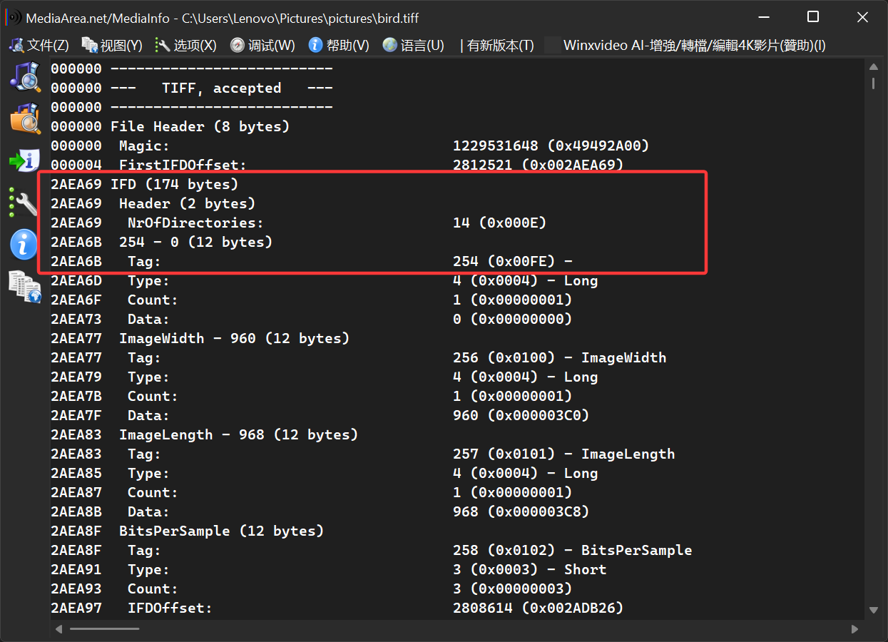 | 4~7 字节 | IFD 地址偏移量:指向 IFD 在文件中的存储位置,便于快速定位 |