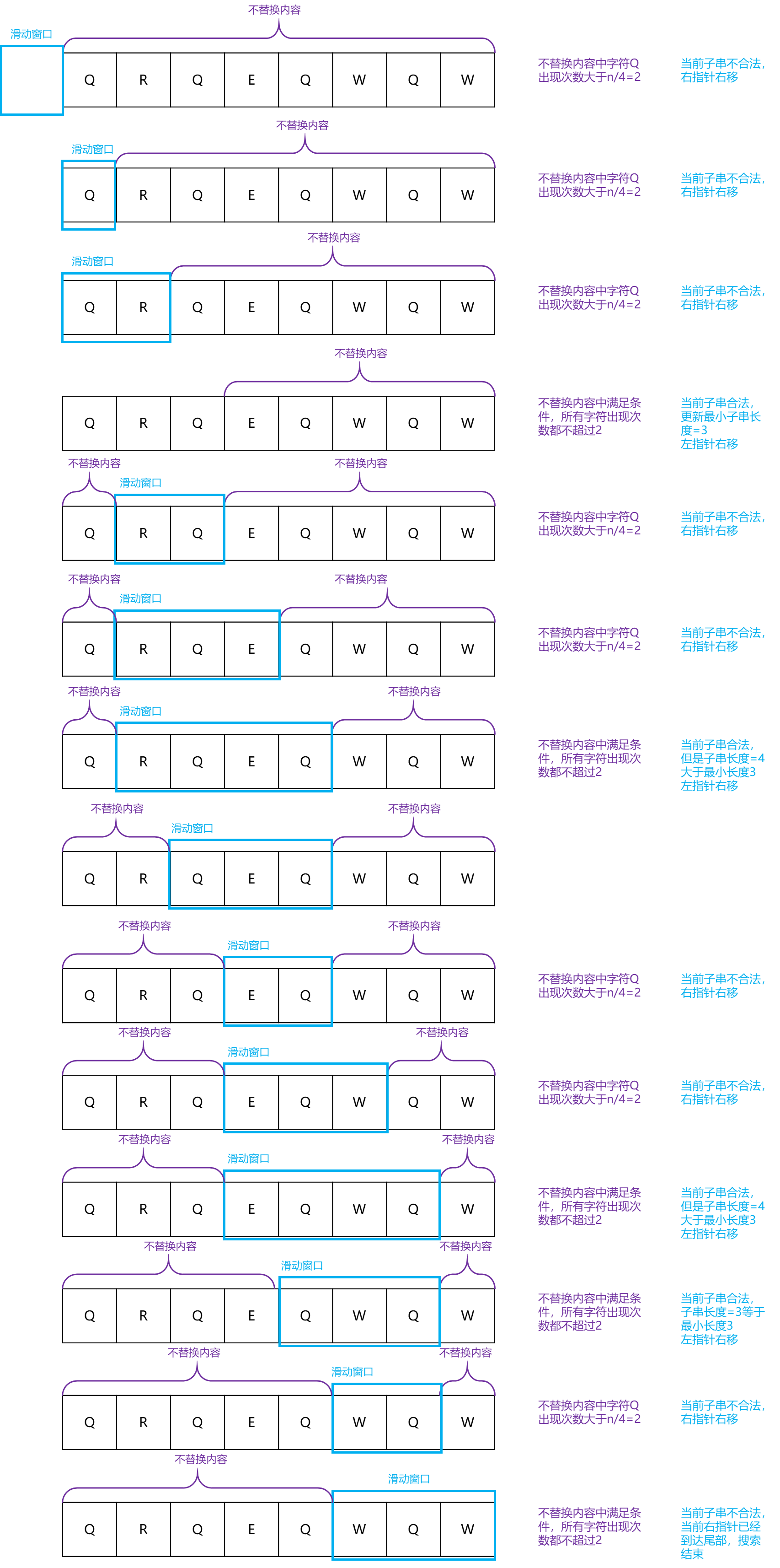 关键点:滑动窗口的左右指针都只向前移动,不会回退
