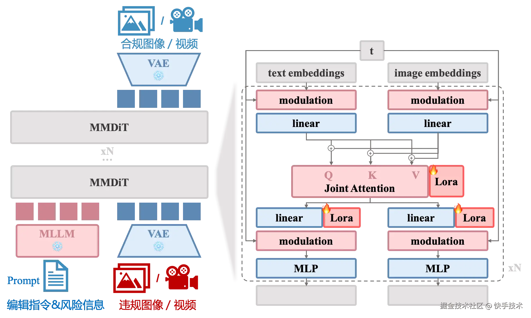 我们采用DiT架构作为模型主干,并通过LoRA微调等技术大幅降低训练成本。为了让模型精准理解"怎么改"、"改哪里"和"为什么改",我们将编辑指令与风险定位信息作为控制条件输入。