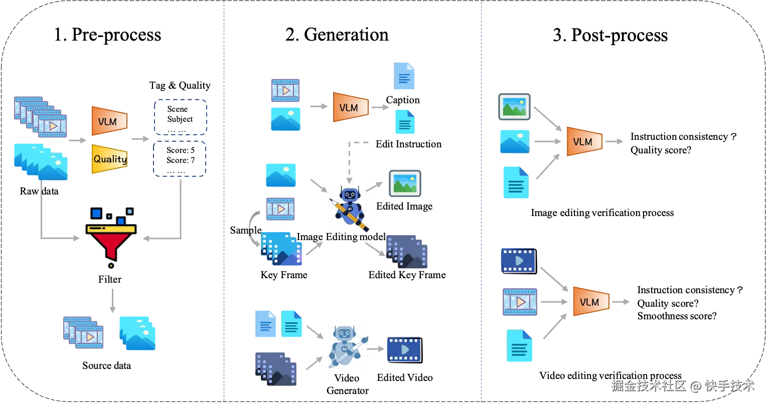 高质量的训练数据是模型的基石。由于广告素材的多样性与复杂性,我们设计了一套 "预处理-生成-后处理" 的数据自动化生成链路,系统性地构建了百万量级的商业化场景数据集,覆盖文本、图像、视频模态,基本囊括了所有常见广告场景,其中图像和视频数据生成链路如图6所示。