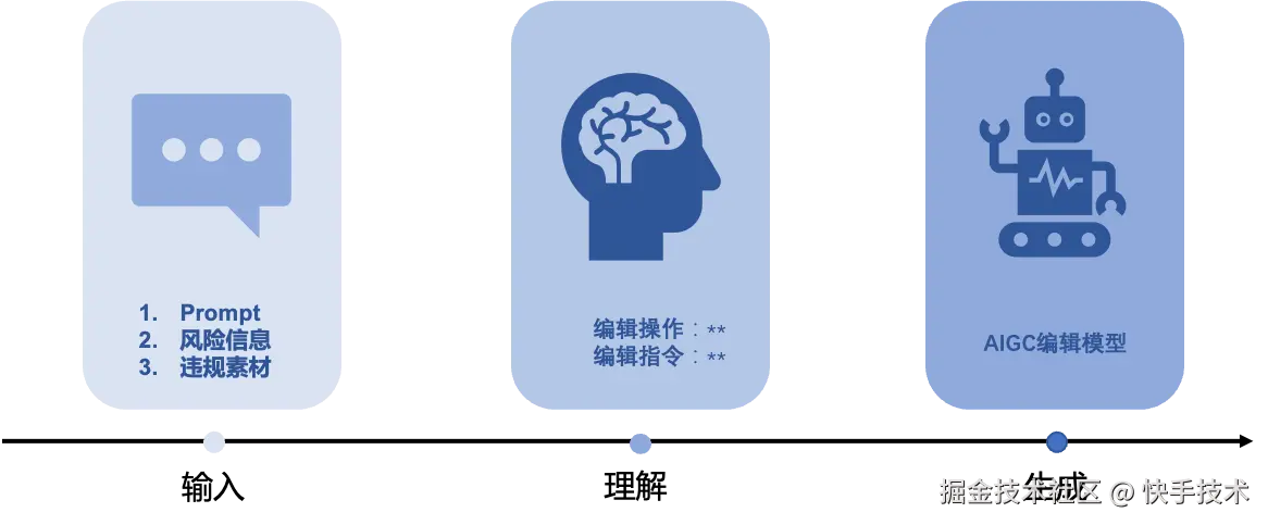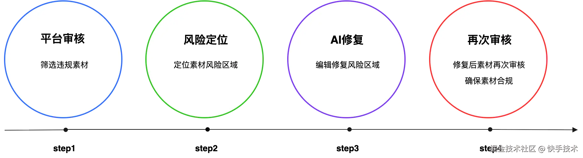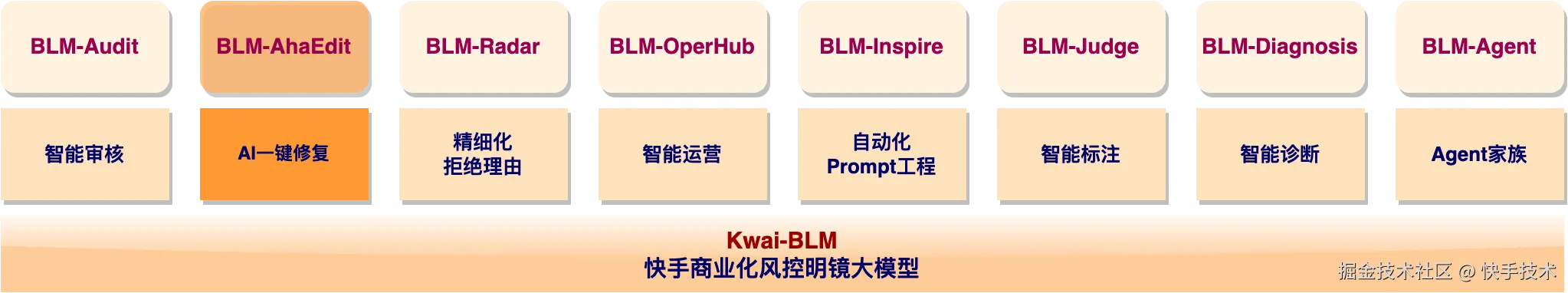 在商业化生态安全场景下,商业化风控围绕自建风控明镜大模型BLM,依据业务所需构建了系列大模型。专门用于修复素材的就是其中的BLM-AhaEdit,这个名字取自"Aha Moment"------期望每一次修复,都不只是简单的合规通过,而是一个能激发灵感、实现"点石成金"的"顿悟时刻"。