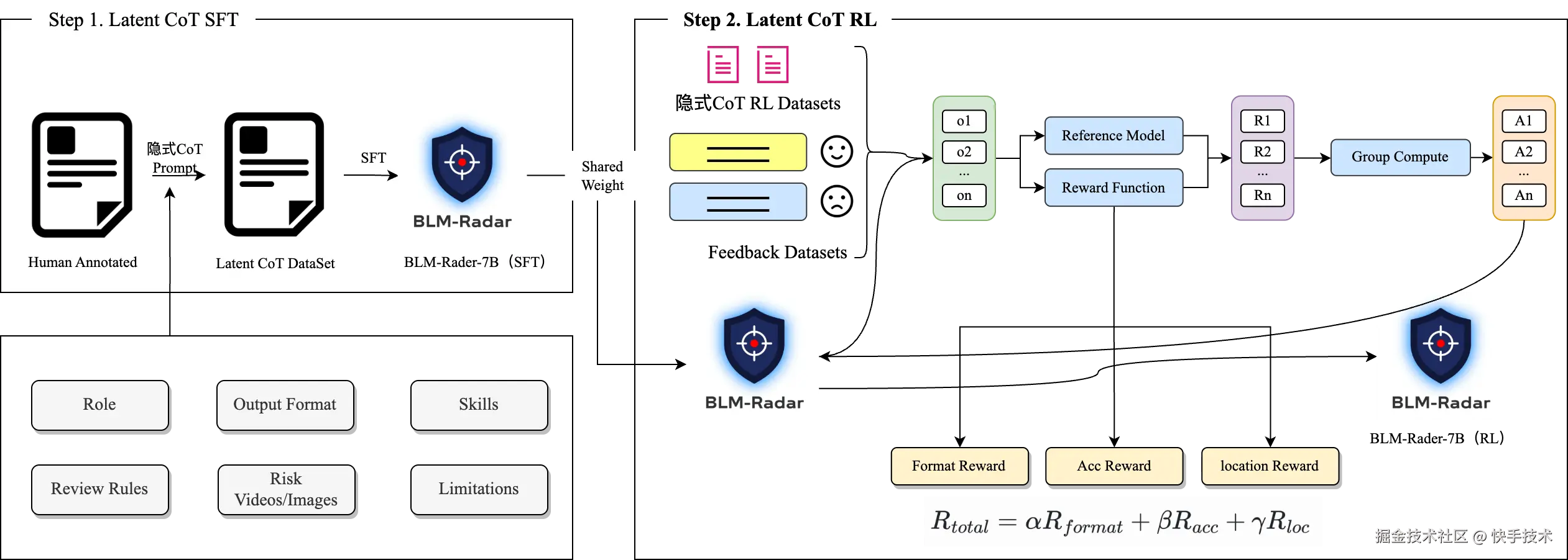 为从根本上解决这一问题,我们摒弃了传统架构,训练了一个"识别与定位一体化"的端到端模型。主要包含两个核心环节:即CoT SFT和RL环节,将风控审核规则与大模型深度融合,完成风险定位能力建设。