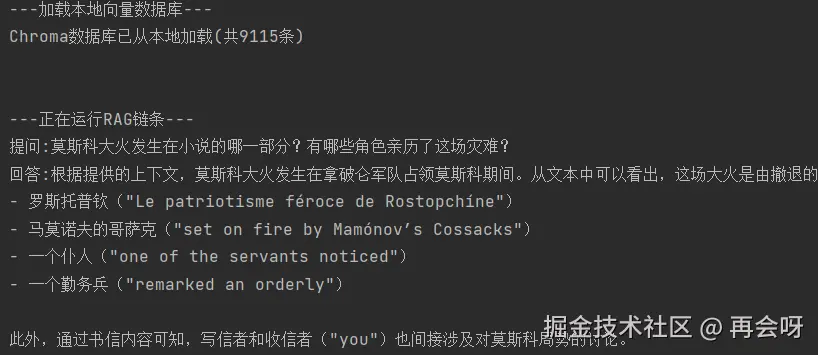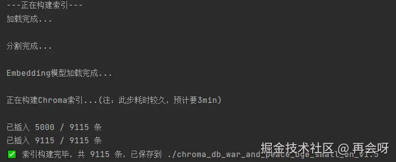 为节省时间,项目已附带预构建好的向量数据库文件夹 chroma_db_war_and_peace_bge_small_en_v1.5,可直接使用,无需重复运行 build_index.py。