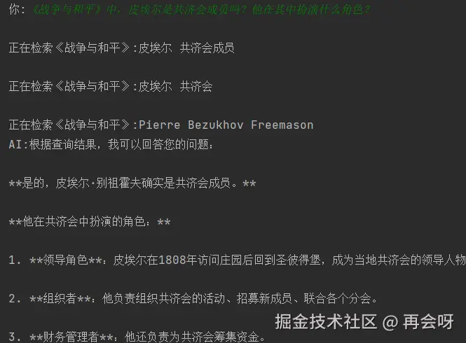 Agent 不仅能调用外部工具(如天气),还能结合历史上下文精准查询私有知识库(如《战争与和平》),真正实现了 "通用能力 + 领域知识 + 对话记忆" 的统一。