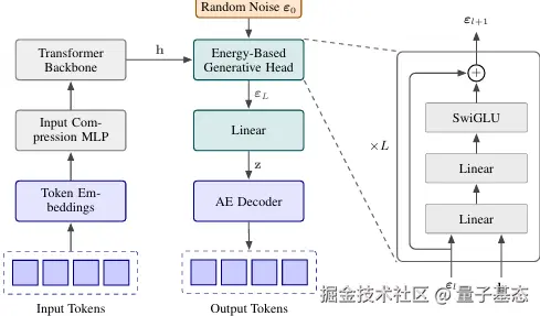CALM 的整体架构由四大模块组成,形成端到端的生成链路:预处理模块对输入文本进行 tokenization,按固定长度 K 划分 token 块;语义压缩模块通过高保真自编码器将每个 token 块转化为连续潜向量;连续生成模块基于 Transformer 骨干网络与 Energy Transformer 生成头,自回归预测下一个潜向量;语义重构模块通过解码器将生成的潜向量转化为 token 序列输出。其中,Transformer 骨干网络采用标准的 Decoder-only 结构,确保模型具备强大的上下文理解能力,生成头则替换为 Energy Transformer 适配连续向量生成需求。