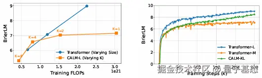 再WikiText-103数据集的测试中,CALM-M(371M 参数,K=4)的参数量略高于 Transformer-S,但训练与推理算力显著降低,性能仅轻微下降。随着参数量增加,CALM-L(735M)和 CALM-XL(1.82B)的性能反超传统 Transformer。