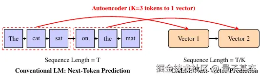 CALM 提出了 "语义带宽" 的核心概念 ------ 即每个生成单元所能承载的语义信息量。通过将 K 个 token 打包为一个连续向量,模型的语义带宽实现了 K 倍提升,生成步骤则相应减少至 1/K。例如当 K=4 时,原本需要 4 步生成的 4 个 token,现在仅需 1 步即可完成,很明显的是效率获得了极大的提升。