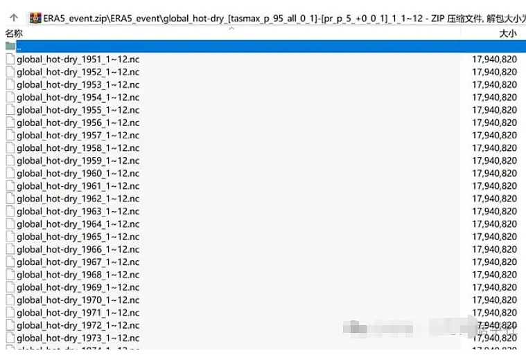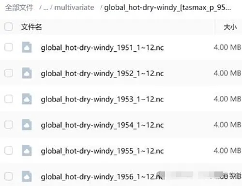 每个文件夹中包含了1951-2023年数据,以global_hot-dry为例查看数据,每一年的数据存在一个nc文件中。如图: