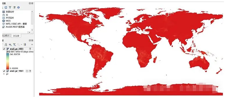 我们以1951年ERA5的总降水量数据为例展示,找到ERA5_daily_pr文件夹,打开后找到era5_pr_1951.nc文件,可用Qgis打开。如图: