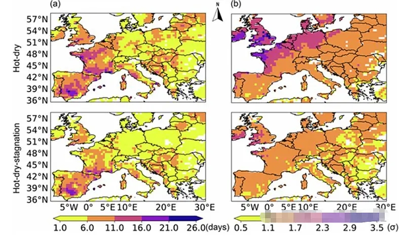 数据作者给出了欧洲2022年夏季复合极端干-热和干-热-停滞事件空间分布图。如图: