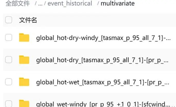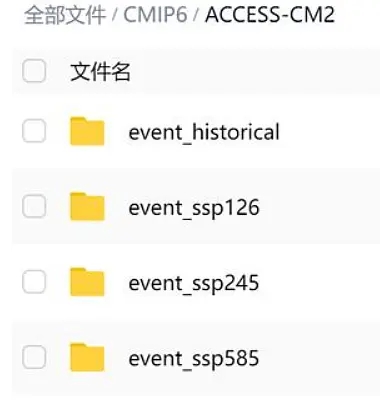 CMIP6中的每个文件夹(代表不同气候模型)的数据结构是一致的,均包含了四个文件夹。我们以ACCESS-CM2文件夹为例来查看数据。Event_historical表示1951-2014年的事实数据,其他三个文件表示2015-2100年不同情景模拟下的极端气候结果。如图: