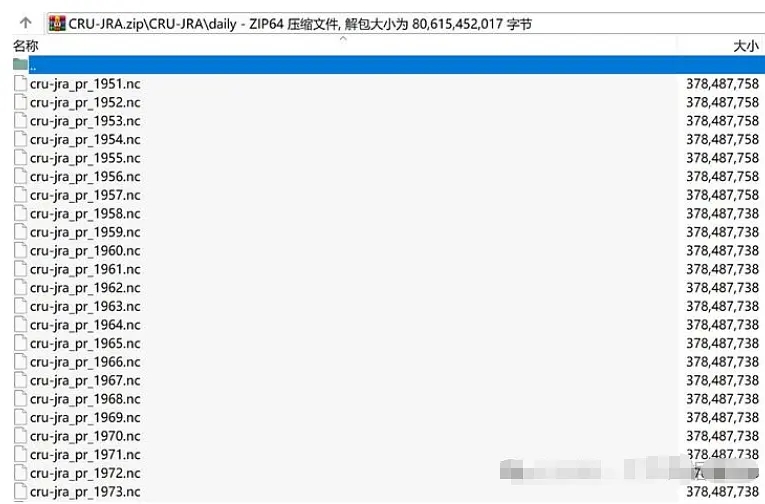ERA5_daily_tasmax、ERA5_daily_pr、ERA5_daily_sfcWind、ERA5_daily_preWind500、CRU-JRA、GLDAS等6个压缩包分别是全球0.5°ERA5(1951-2023年)、CRU-JRA(1951-2021年)和GLDAS(1951-2014年)逐日最高气温(tasmax)、总降水量(pr)、地表平均风速(sfcWind)、500hPa平均风速(preWind500,仅ERA5可用)数据。以CRU-JRA为例来看,压缩包内包含了1951-2021年pr、tasmax、sfcWind三个气候数据,每一年数据储存在一个nc文件中。如图: