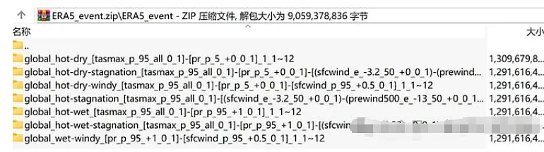 我们先看ERA5_event文件。压缩包内包含了逐年复合极端干-热(global_hot-dry)、湿-热(global_hot-wet)、湿-大风(global_wet-windy)、干-热-大风(global_hot-dry-windy)、热-停滞(global_hot-stagnation)、热-干-停滞(global_hot-wet-stagnation)和热-湿-停滞(global_hot-wet-stagnation)7个文件夹。如图: