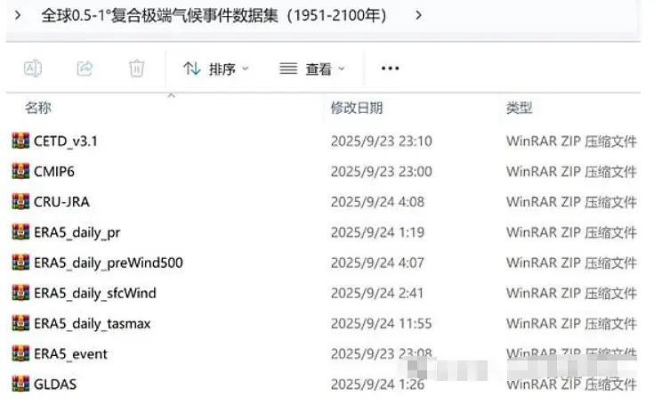 数据集中包含9个压缩包。CETD_v3.1压缩包包括了全球复合极端气候事件检测分析工具。以ERA5、CRU-JRA、GLDAS、CMIP6命名的压缩包是不同的气候数据集。如图: