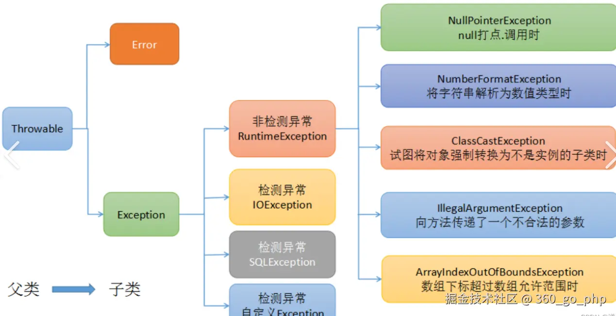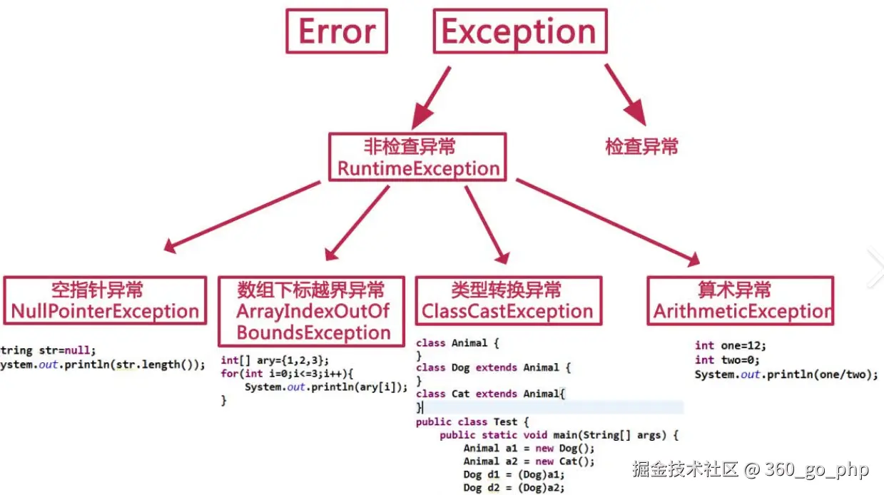 RuntimeException的异常,如NullPointerException、ArrayIndexOutOfBoundsException。非受检异常通常表示程序错误,编译器不强制要求处理,更多的是程序员自觉进行修复。