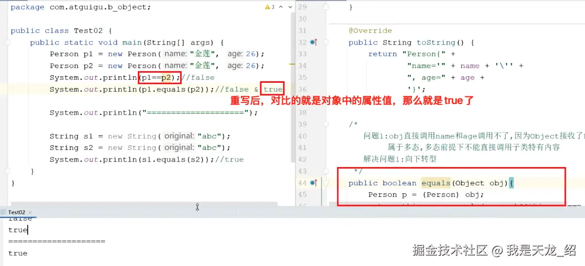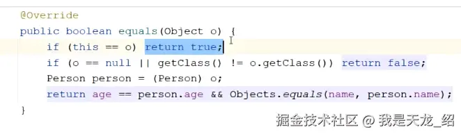 因为比较的只是name和age的值,因为p1和p2里面内部的值是不是一样的。是,那就完事了。 那就是相等。