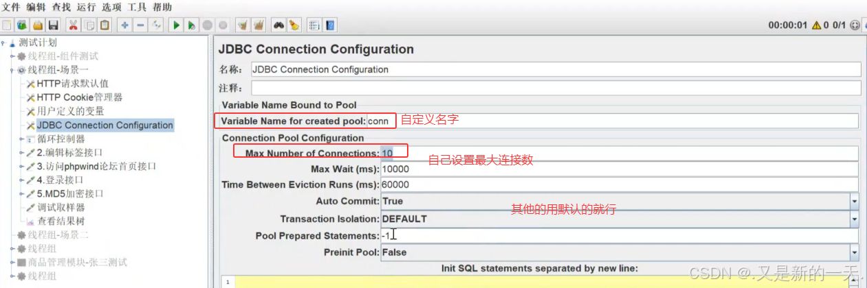 2.引入一个链接数据库的组件:jdbc connection configuration--一定要放到最上面,先连接之后才能使用