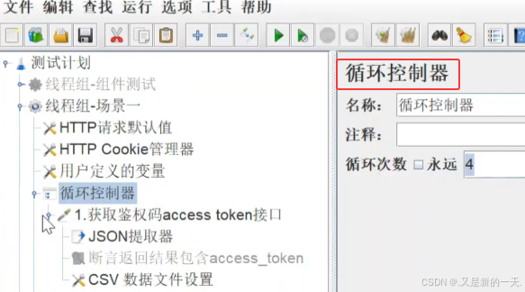 如上我们需要循环4次(4组数据就循环4次):添加-逻辑控制器-循环控制器: