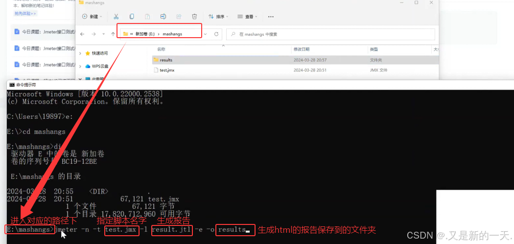 - 利用Jmeter生成报告:进入到对应的位置jmeter -n -t test.jmx -l result.jtl -e -o results