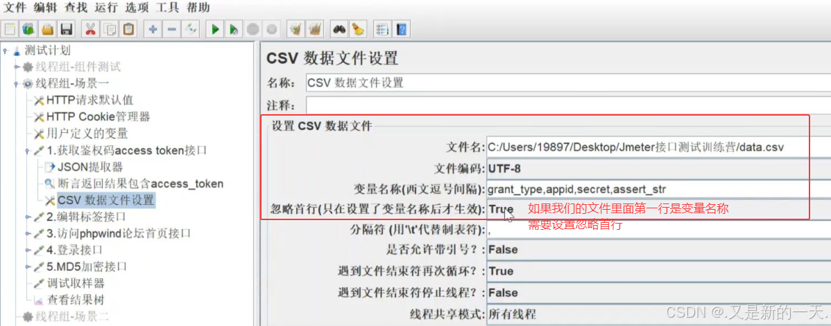 - Jmeter数据驱动:添加-配置元件-CSV Data Set Config(CSV数据文件设置)
