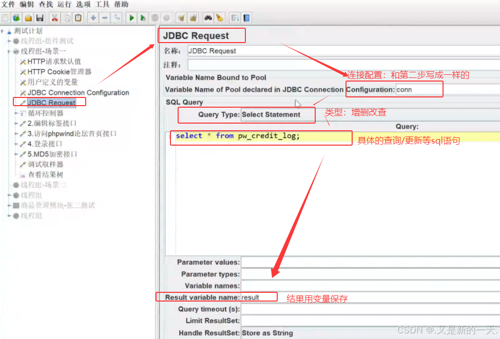 3.添加JDBC请求:引入一个jdbc request组件发送请求