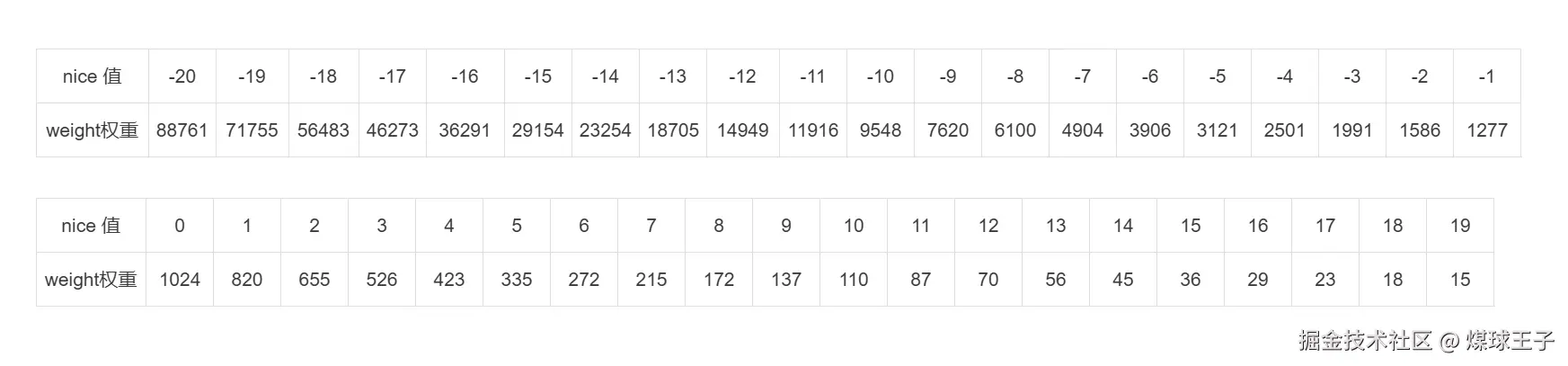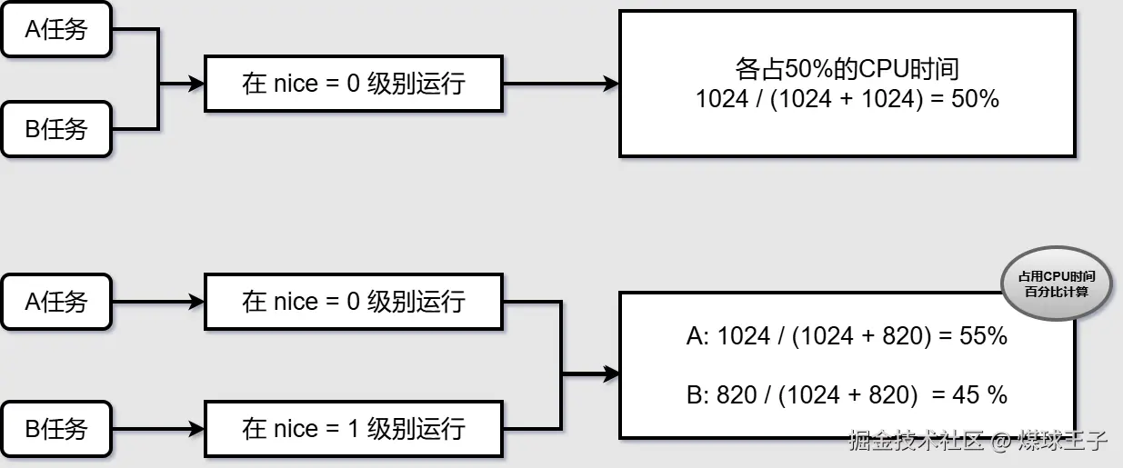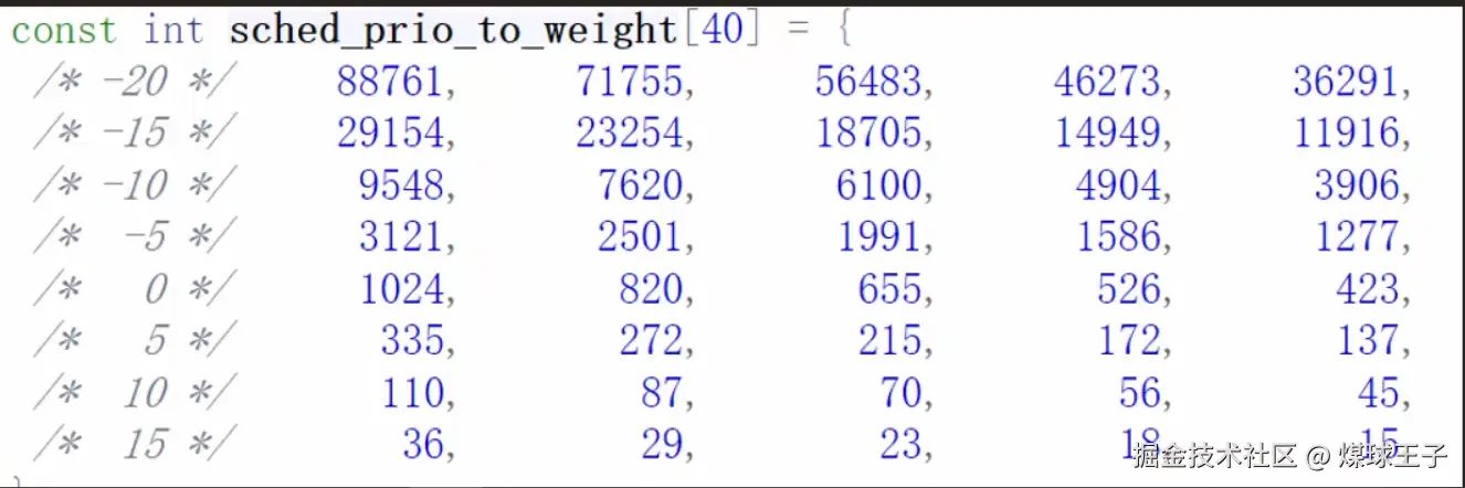 Linux内核中 nice 值对应的权重,封装在 sched_prio_to_weight 数组中, 通过这个权重能计算出每个任务能公平占用CPU时间百分比,每降低一个nice值,则多获得10%的CPU时间。 每升高一个nice值,则放弃10%的CPU时间。