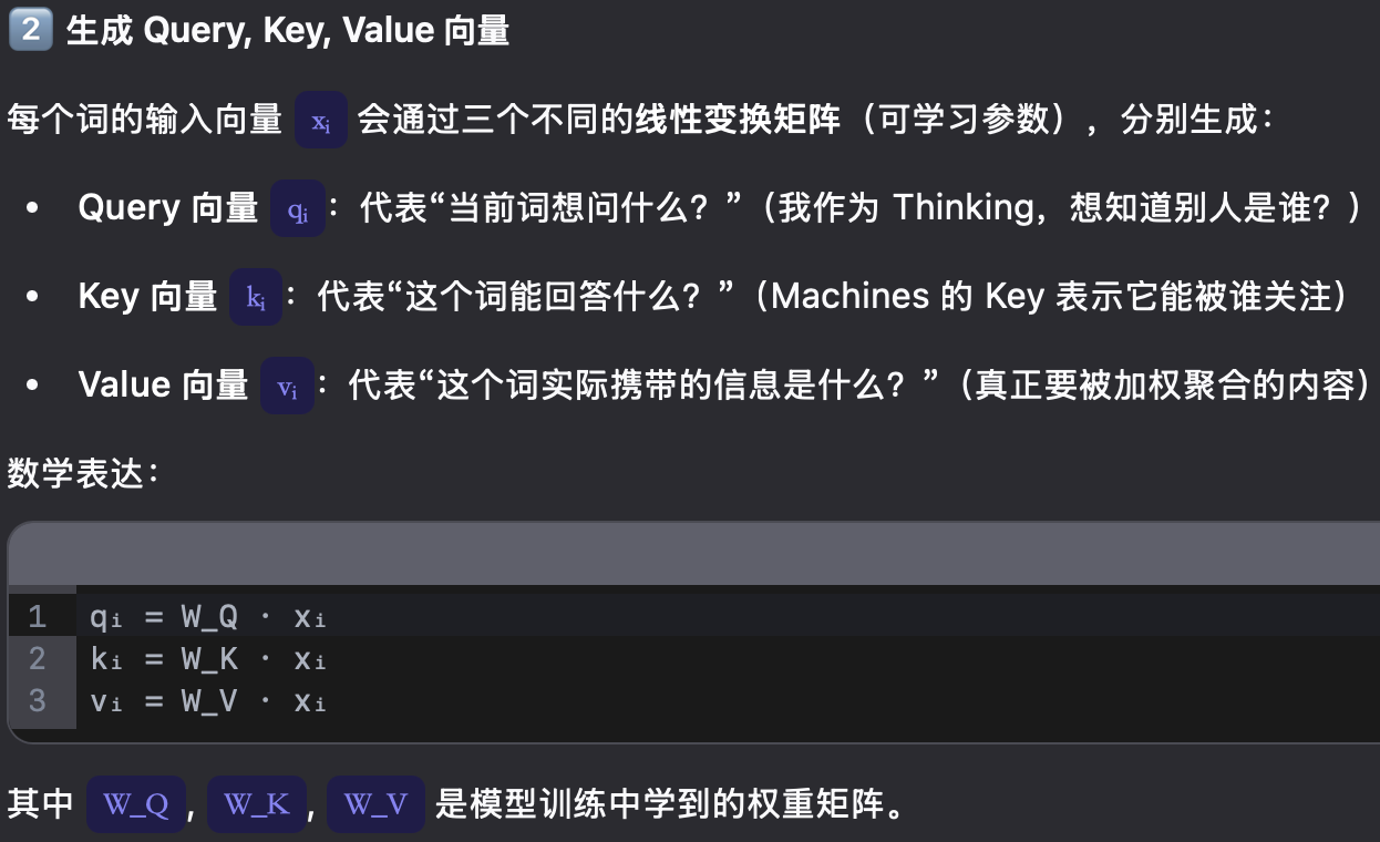 - Self-attention原理。矩阵X中的每一行,表示输入句子中的每一个词的词向量,QKV三个矩阵来自同一输入,首先计算q和k之间的点积,为了防止结果过大用softmax操作将其结果归一化为概率分布,再乘以V就得到权重求和的表示。dk是key向量的维度,除以根号dk是为了让反向传播的时候求梯度更加稳定。softmax将分数归一化,使得它们都为正数且和为1