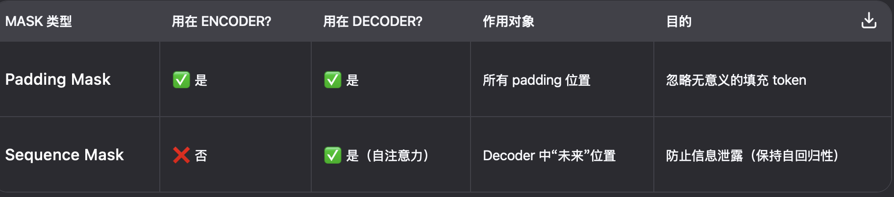 padding mask:每个批次输入序列的长度不一样,所以要对在较短的输入序列后面补0,太长的是截断。这些填充的位置没什么意义,所以我们的attention机制不应该把注意力放在这些位置上。具体做法:把这些位置的值加上一个非常大的负数,这样经过softmax后,这些位置的概率就会接近0。