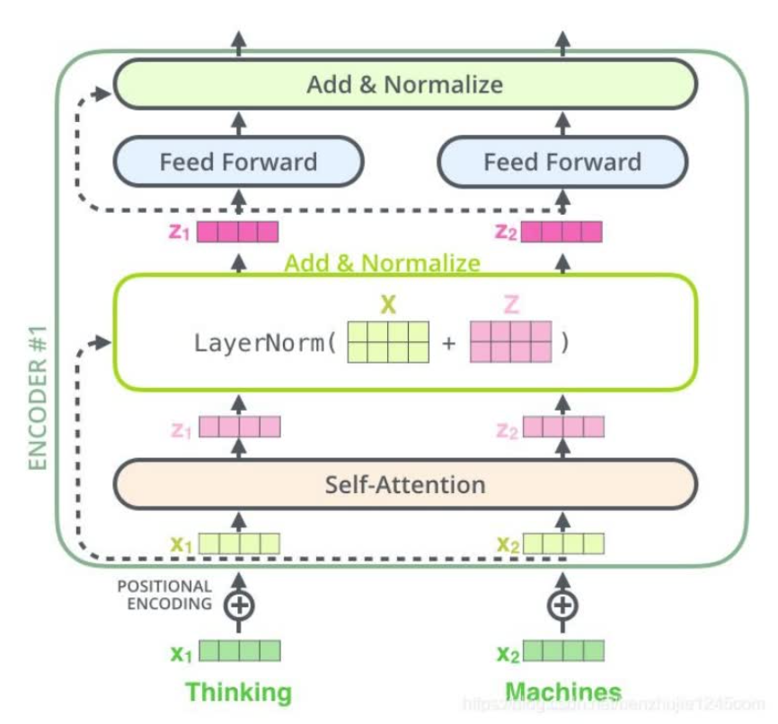 残差连接和层归一化。每个编码器的每个子层(sa和ffn)都有一个残差连接,再执行一个layer norm操作。