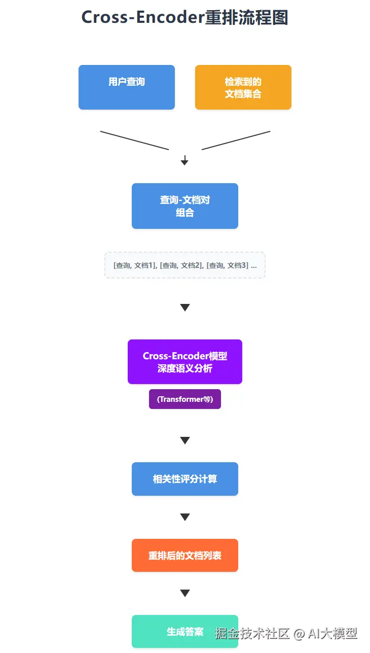 RRF算法实现的重排它不涉及检索结果与查询之间的语义关系。而Cross-Encoder重排就是基于Cross-Encoder模型,在语义层面上实现的重排。