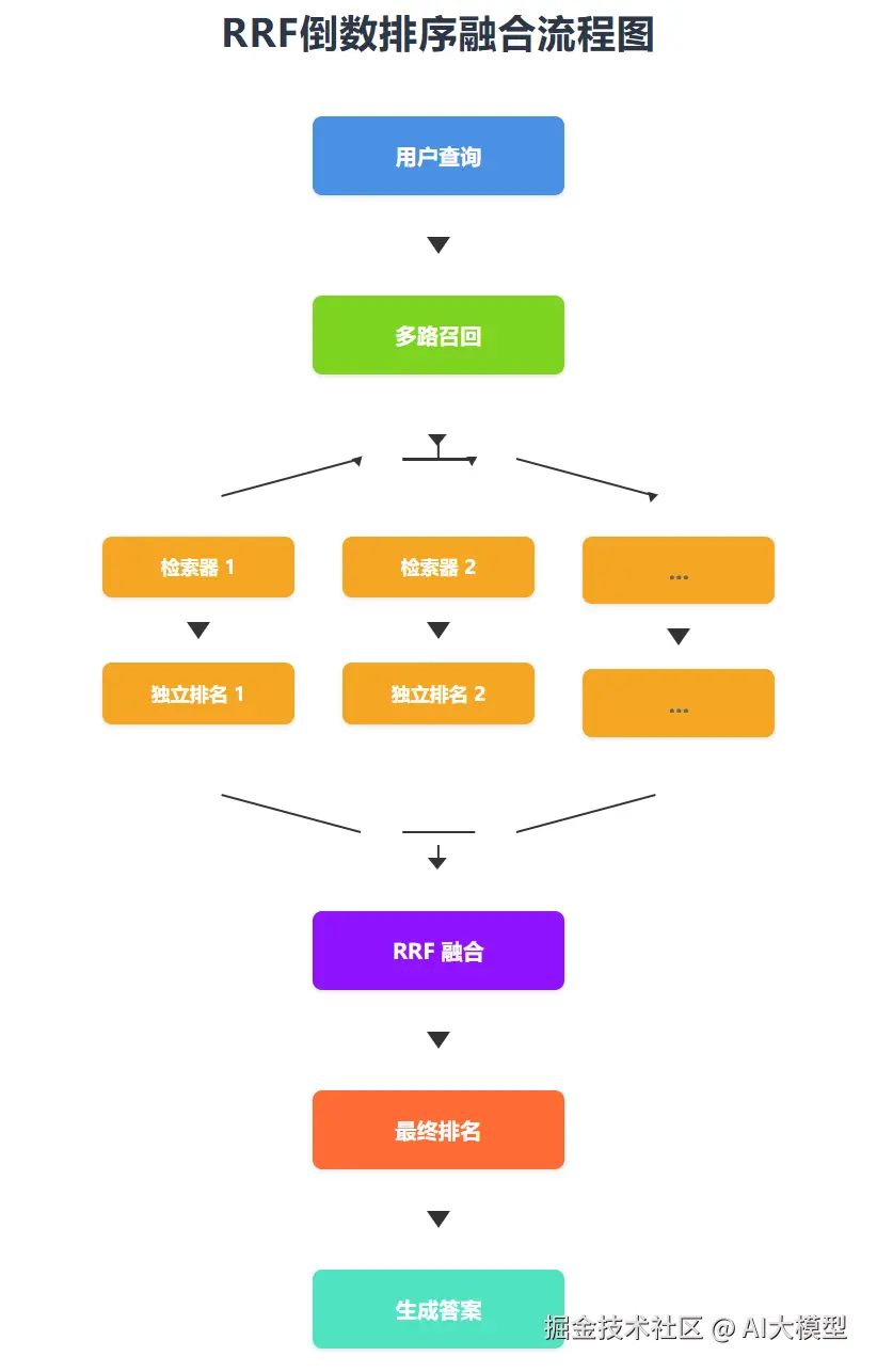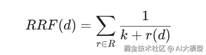 这样,对于一个文档 d,它在每个检索结果列表中的排名越高(即 r(d) 越小),其分母 (k+r(d)) 就越小,分子 1 不变,所以该文档在该列表中的得分就越高。最后,将这个文档在所有检索列表中的得分相加,就得到了它的最终 RRF 分数。得分越高,最终排名就越靠