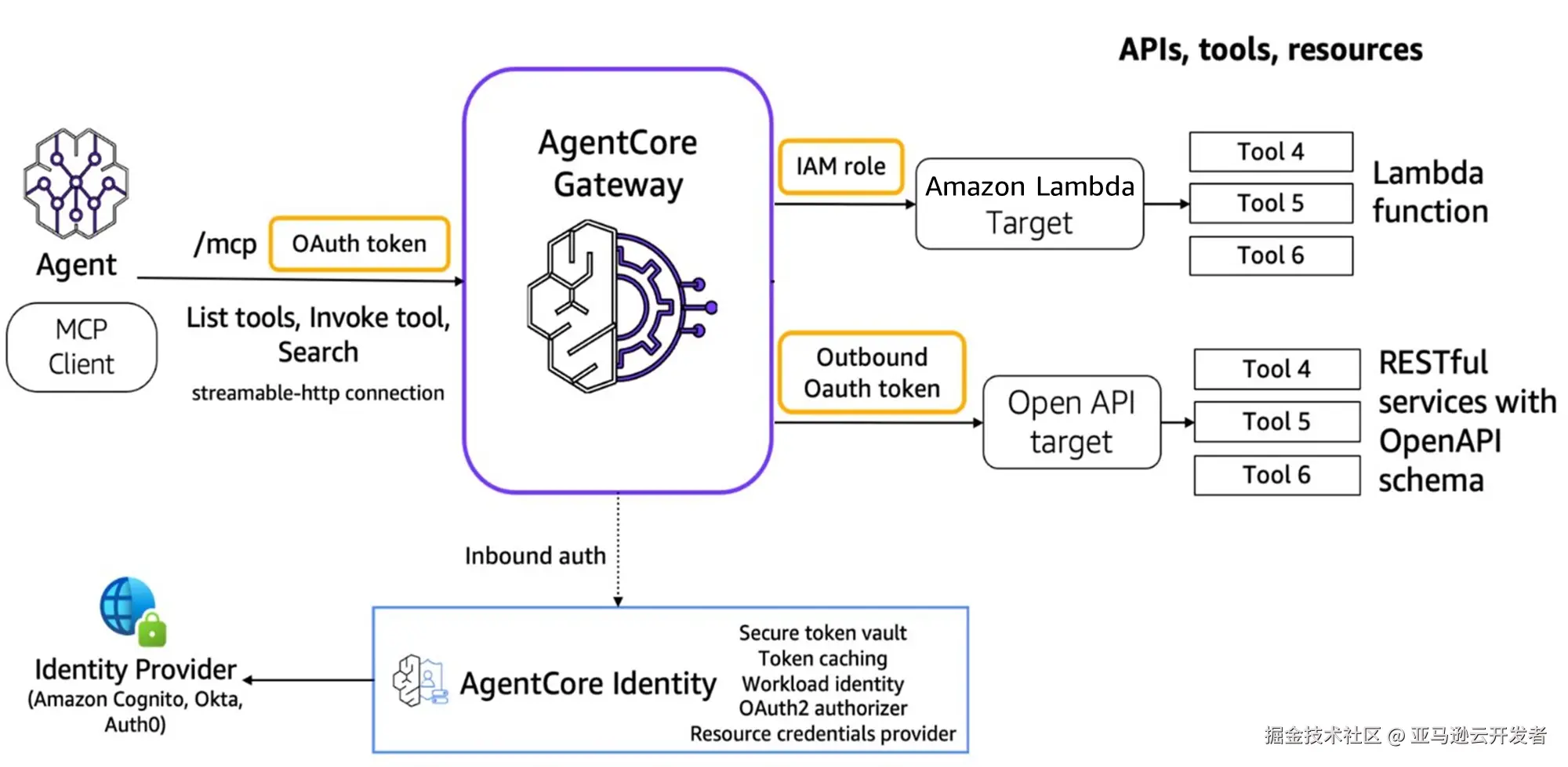 - Gateway(网关):帮助Agent安全地以MCP协议连接现有工具和API服务,简化工具集成