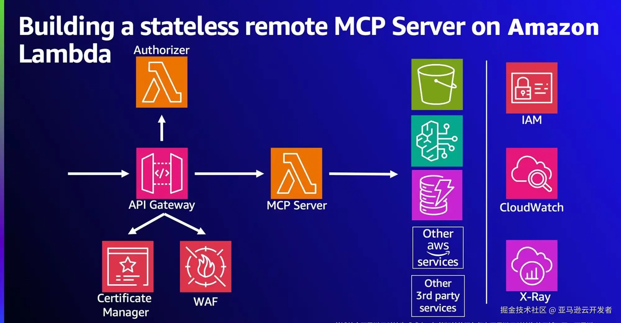 Amazon Lambda 特别适合处理无状态的 MCP 服务器场景。这类场景通常包括网络搜索、API 调用等无状态操作,采用单次请求-响应模式,任务运行时间相对较短。Lambda 的事件驱动特性与这种使用模式高度契合。