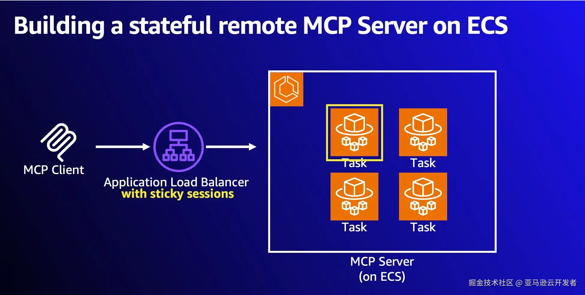 与无状态的 Amazon Lambda 相比,容器环境无疑适合处理有状态的 MCP 服务器场景。这类场景包括多轮对话场景(如 Playwright 自动化),需要保持状态的长时间运行任务,以及处理时间较长,需要通过 Server-Sent Events (SSE) 不断发送进程或中间结果的应用。容器化部署更为灵活,对于复杂,或依赖外部组件的 MCP 服务器更为方便。您可以将依赖的组件和 MCP 服务器构建在同一个容器镜像中,MCP 服务器和依赖项可通过跨进程调用或本地网络进行交互,降低复杂度。