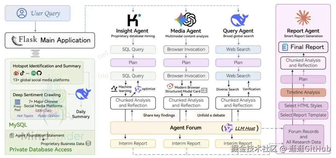 每个 AI 智能体都有专门职责:Query Agent 负责广度搜索,Media Agent具备强大的多模态理解能力,Insight Agent 专门挖掘私有数据库,Report Agent 则负责最终的报告生成。
