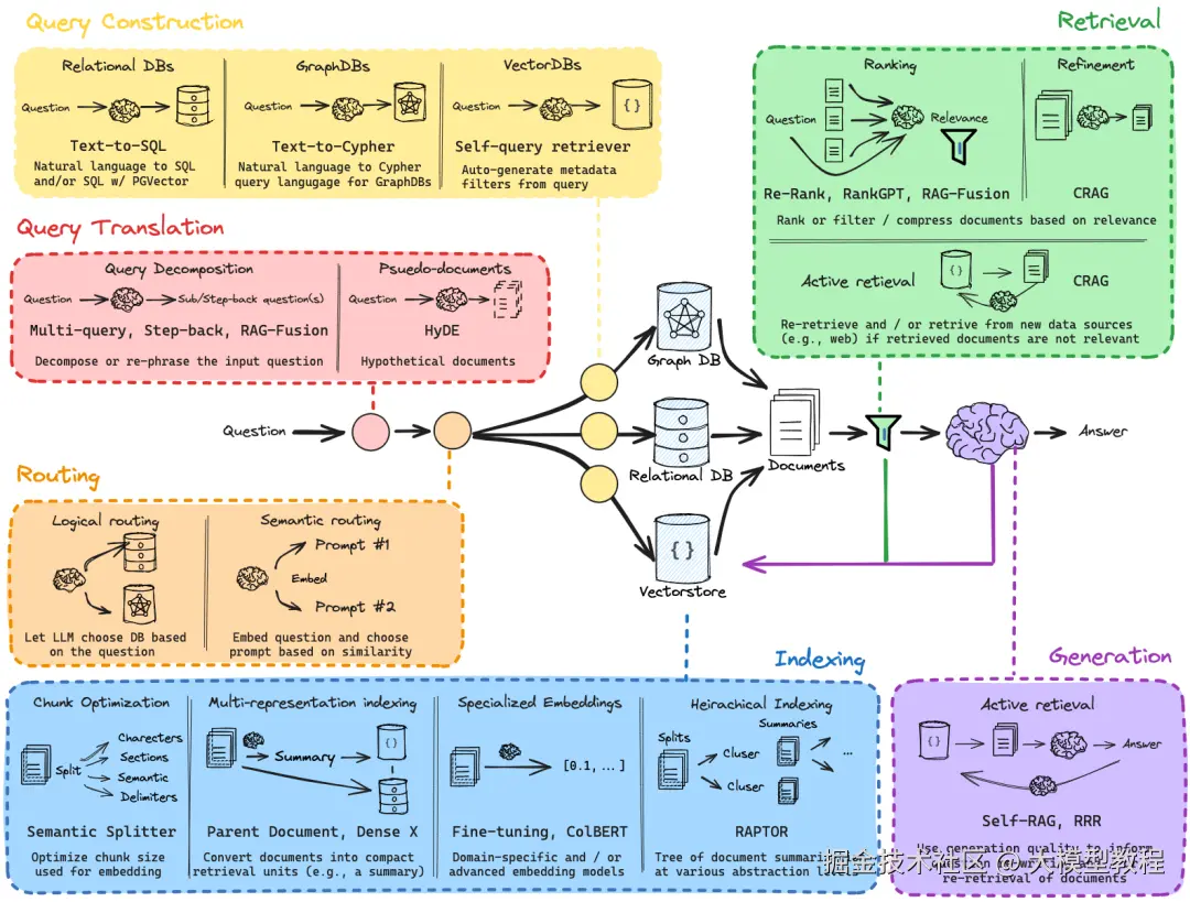 - • 查询翻译:通过多查询生成+步退查询,赋予系统"多角度思考"的能力;