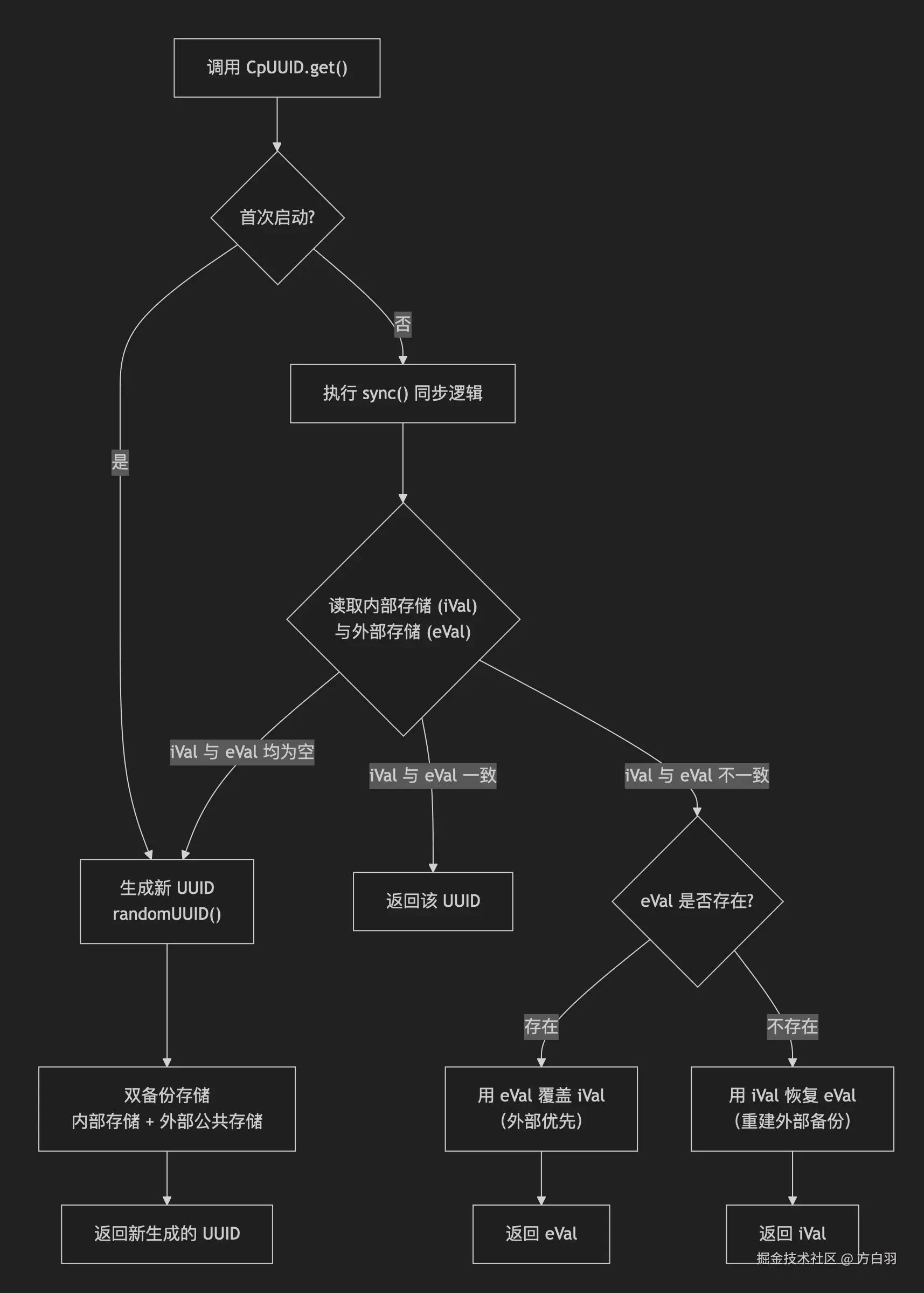 UUIDUtils的设计目标非常明确:在用户卸载 App 后,依然能够恢复同一个设备 ID。其核心工作流程如下图所示,清晰地展示了 ID 的生成、同步与恢复策略: