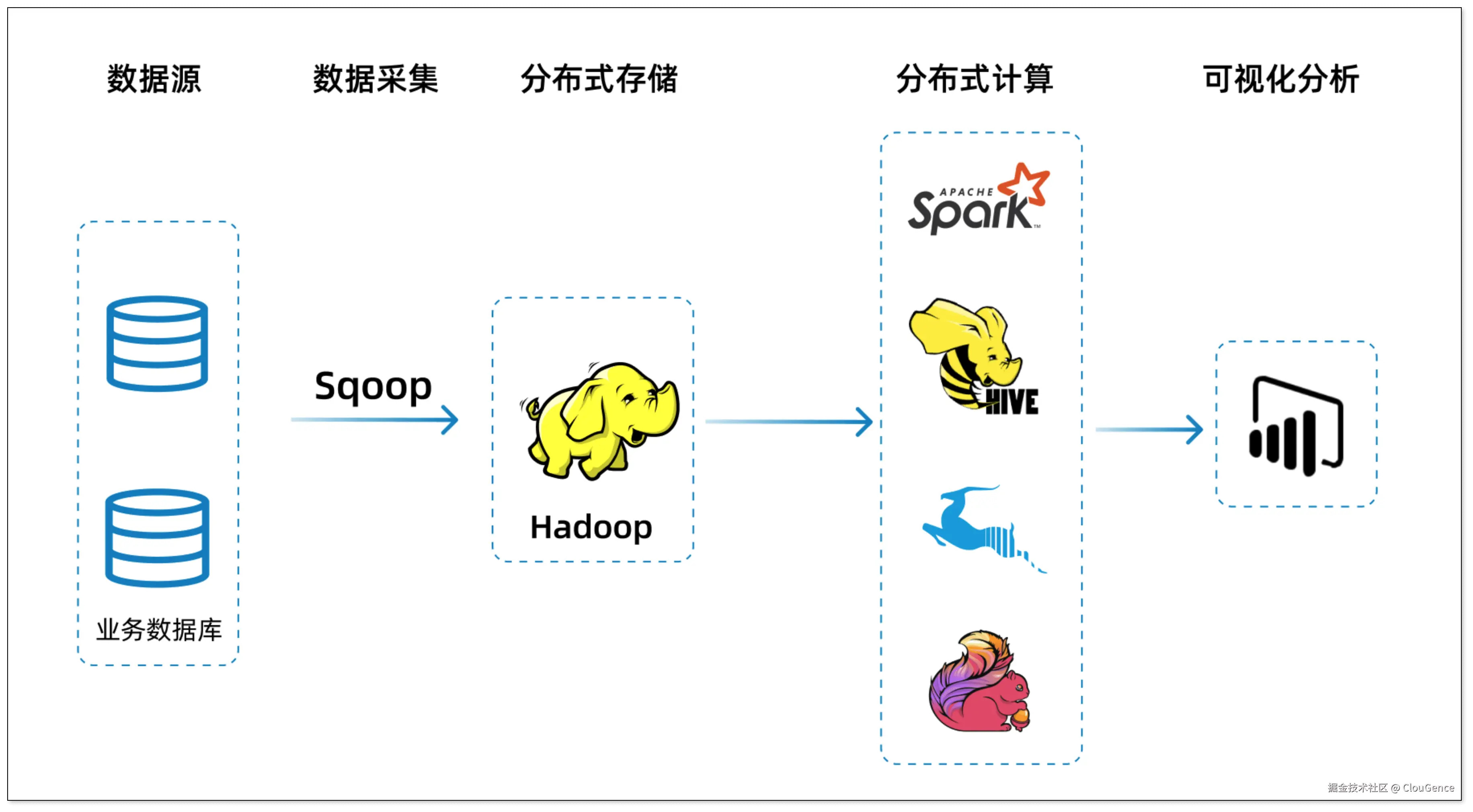 百草味的数据平台建设始于 2017 年。当时,百草味基于 CDH 自建大数据平台,通过 Sqoop 将业务数据库的数据传输至 Hadoop 。离线报表采用 Hive ,实时报表则采用 Apache Spark,并通过 BI 工具进行可视化分析。