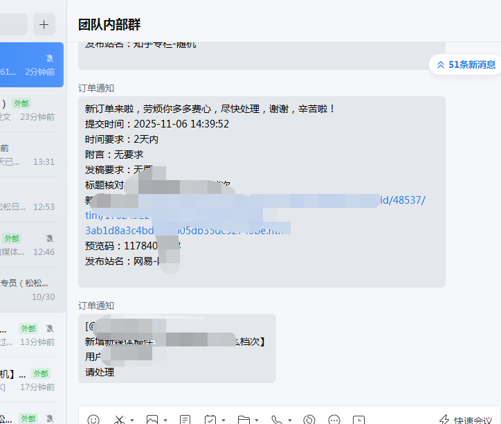 这是我们在企业微信上和松松云后台对接的一个功能,用户所有的操作,如发稿、下单、注册、修改,这里都会收到通知。