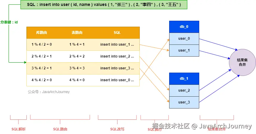 orders_0,orders_1)。 - 分库又分表:最常见的组合,兼顾了数据库和表的负载。