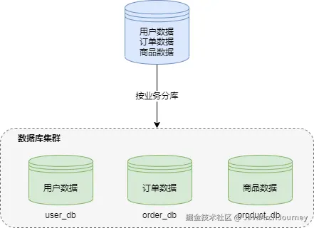 - 垂直分库:将不同业务模块的表拆分到不同的数据库实例中,也常被称为"按业务分库"。适合将表中某些不常用且占了大量空间的列拆分出去。