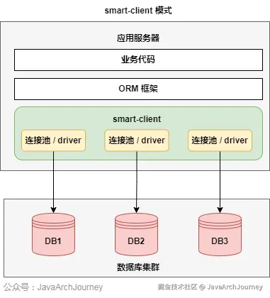- 客户端代理方式(smart-client 模式) :在应用程序中集成分片逻辑的 SDK 或驱动(如 ShardingSphere-JDBC),由客户端直接根据配置的分片规则解析 SQL、计算路由并连接正确的数据库实例执行操作。该方式无需额外部署代理服务,性能较高、延迟低,但会增加应用的依赖和复杂性,且需为不同语言维护各自的客户端组件。