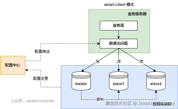 - 1、程序代码封装方式(smart-client 模式) :在代码层面抽象出一个数据访问层来管理读写操作分离和数据库服务器的连接。这种方式实现相对简单且可根据业务需求进行定制化调整,但每种编程语言都需要独立开发,对于多语言编写的系统而言,增加了重复开发的工作量,并且在主从切换时需要对所有系统进行配置更新和重启。开源项目如淘宝的 TDDL 即采用此方法,基于集中式配置实现 JDBC 数据源,支持主备切换、读写分离等功能。