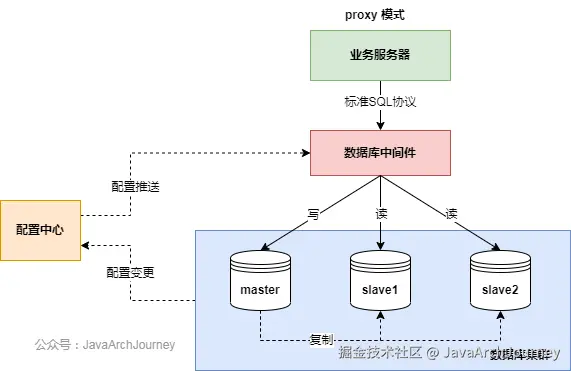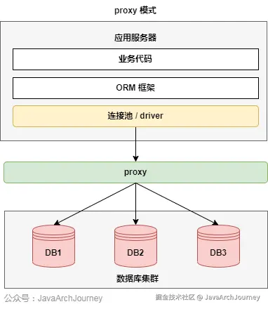 - 2、中间件封装方式(proxy 模式) :通过独立的系统提供标准 SQL 接口来实现读写分离,这种方式能够支持多种编程语言,但由于需处理完整的 SQL 语法和数据库协议,其实现更为复杂,要求较高的性能,不过它能自动感知数据库主从状态并进行相应调整,无需业务服务器做出改动。开源项目如 MySQL Router,它能够在主从切换时保持业务逻辑的透明性。